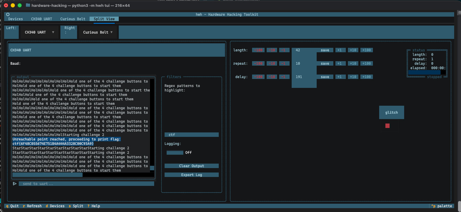 Quick plug for something I’ve been working on. I personally went with a curious supplies bolt for glitching and created a TUI to show side by side UART output and glitch controls. It’s pretty basic for now, but I’m hoping to enhance with more features for BP. I’m hoping to get UART passthrough and glitching implemented with flatbuffers to have BP be the primary driver. The Bolt CTF device that comes with it has been great for learning, we need more devices like that.