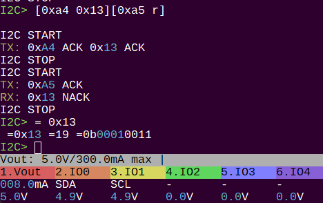 The Bus Pirate can sit and wait for the I2C_INT pin to go high, accessing the chip only after a USB supply is attached.