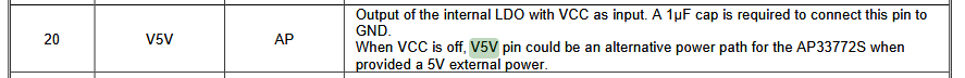 The datasheet mentions that the V5V 5 volt LDO output can be used to power the chip when USB isn’t attached. It doesn’t say anything else though, such as does the external supply need to be removed to avoid damage to the on-chip LDO regulator? I wrote Diodes INC to ask, but I rarely hear anything back from chip companies.