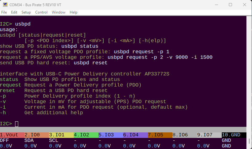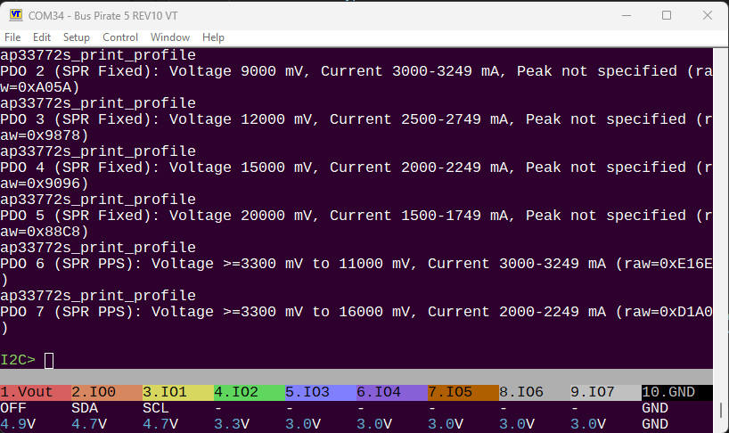 When I tested the AP33772S I ran into an issue where the chip expectes to be powered from the USB source, not independently as we do with the Bus Pirate. The causes the chip to hang after USB C is attached and removed once, a power cycle is needed to get it back online. This isn’t great for a design where we want the chip to be an always-on device for testing USB supplies.
