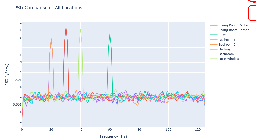 - Simply visualize/confirm that there is a vibration here that isn’t present in surrounding buildings. Have some actual data so I’m more than a mad man ranting about the walls closing in on me.