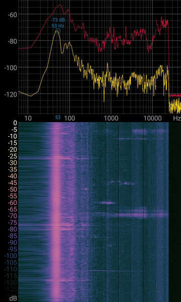 - I tried several audio spectrograms, but it’s a vibration not a noise. I think I see resonate frequencies produced by the vibration, compared to say the quiet room of the library, but I’m not certain. The 47kHz line seems to be coming from the phone itself, its always present even outdoors on a quiet night.