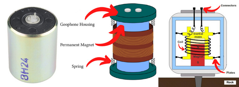 Seismic accelerometers are very expensive, so let’s look at geophones. Geophones are magnets inside a metal coil that produce a voltage when the magnet shakes.