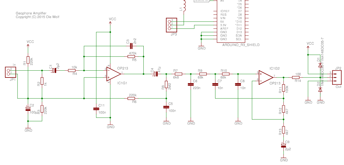 Geophones make a tiny voltage when measuring something like an earthquake 2000km away. Amateur seismology devices use an op-amp to amplify the voltage, and tend to use high resolution ADCs (24bits+). However the gain doesn’t seem to be that significant, this example only uses a ADS1115 16bit I2C ADC with programmable 1-16x gain, and that seems sufficient. In comparison, the current measurement on the Bus Pirate uses a gain of 32+.