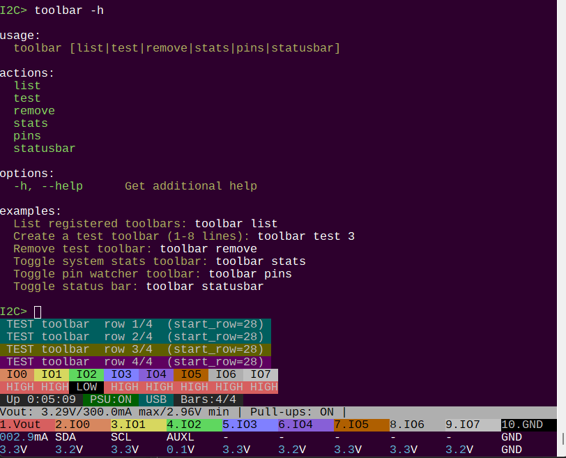 The experimental firmware has a new system to support the existing toolbars (status, logic analyzer), as well as two simple new demo-bars (stats, pins).