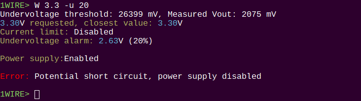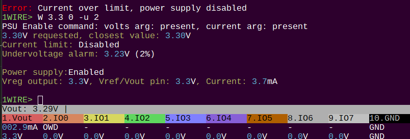 If I understand it correctly you want to disable voltage monitoring for commands like W 3.3 or W 3.3 50? At least I donât see a monitoring setting in above pictures for these commands. Usually there is no reason to disable voltage monitoring as a wrong voltage on output is a faulty condition. So therefore I request to have it always enabled with e.g. 10% if nothing else is specified with -u.